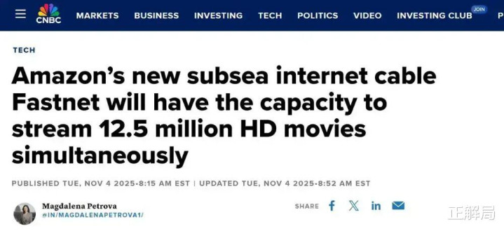 就拿亚马逊的Fastnet海底光缆来说,设计容量不低于320Tb/s,传输速率相当于每秒可传输1250万部高清电影。