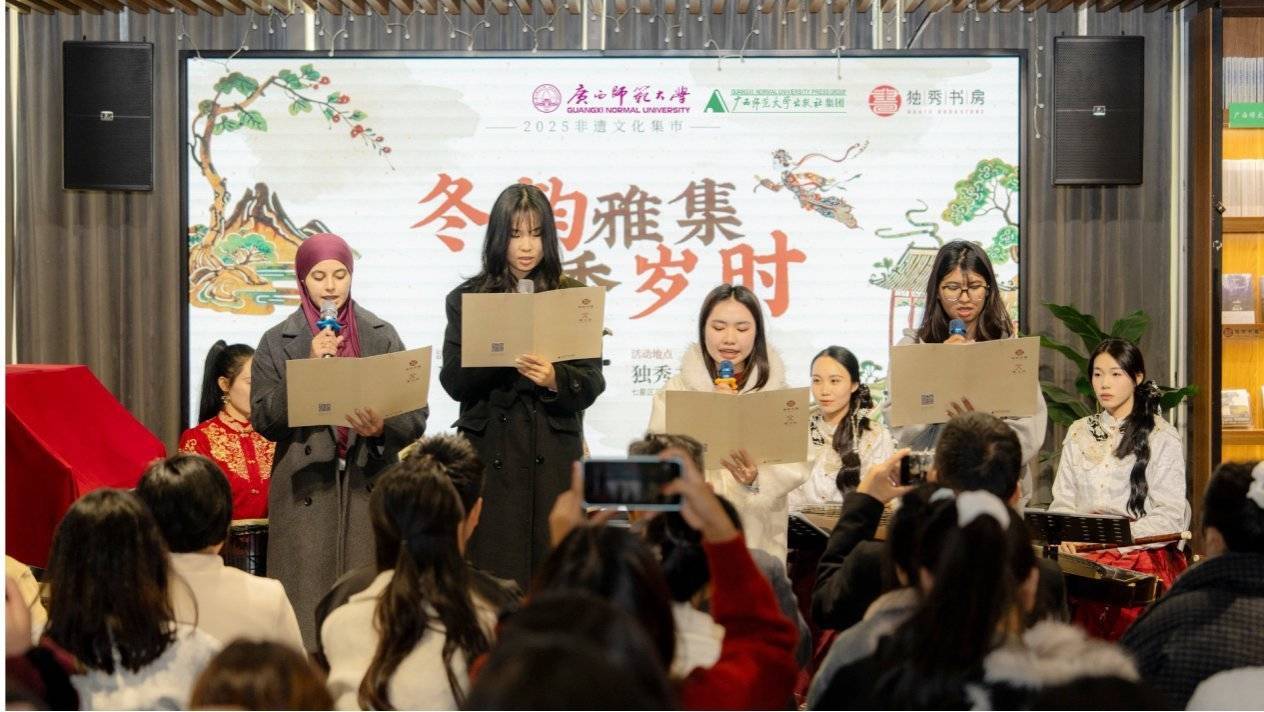 12月26日,“冬韵雅集 书香岁时”文化市集在桂林独秀书房·旗舰店举行。本次活动由广西师范大学出版社集团指导,广西师范大学出版社集团国际事业本部、独秀书房公司举办,广西师范大学国际文化教育学院协办,旨在以传统文化为载体,搭建中外青年交流平台,推动文明互鉴与城市文化氛围共建。